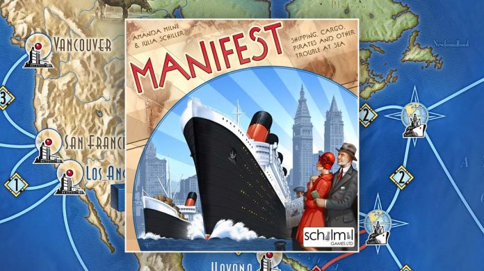 Manifest provides a beautiful presentation centered around a sprawling, colorfully illustrated map of the world. The artwork and typography pays homage to the distinctive deco/20s style travel art still popular today. The playing cards are printed on a nice linen card stock that is complemented with a series of wooden meeples, cubes and mini-ships. Overall the production is very well done and should please anyone drawn in by the theme.